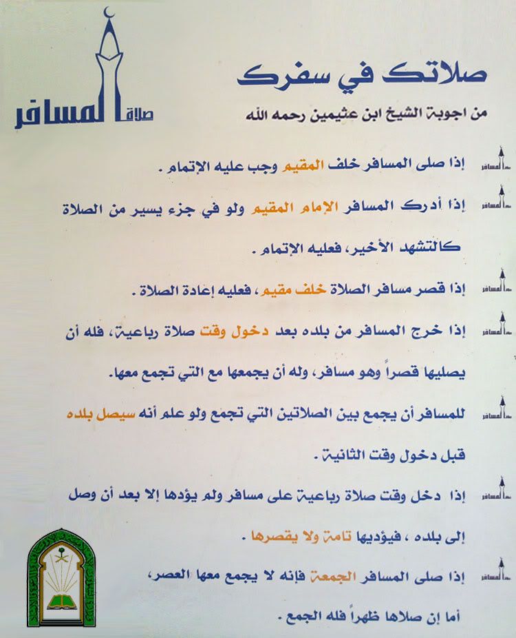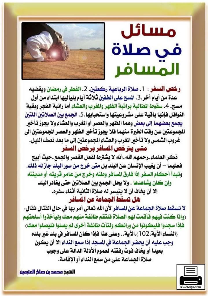بما أن هذه الايام اجازات وسفر وتنقل بين المدن فالكثير من الناس قد يجهل بعض أحكام صلاة المسافر لذلك هذه بعض المسائل التي يكثر السؤال عنها من المسافرين من أجوبة الشيخ محمد بن عثيمين رحمة الله تعالى جعلنا الله واياكم هداتا مهتدين .... أقرأها فهي لن تأخذ منك أكثر من (5) دقائق فقط فهي مختصرة ومركزة لعل الله ينفع بها كل من قرأها...