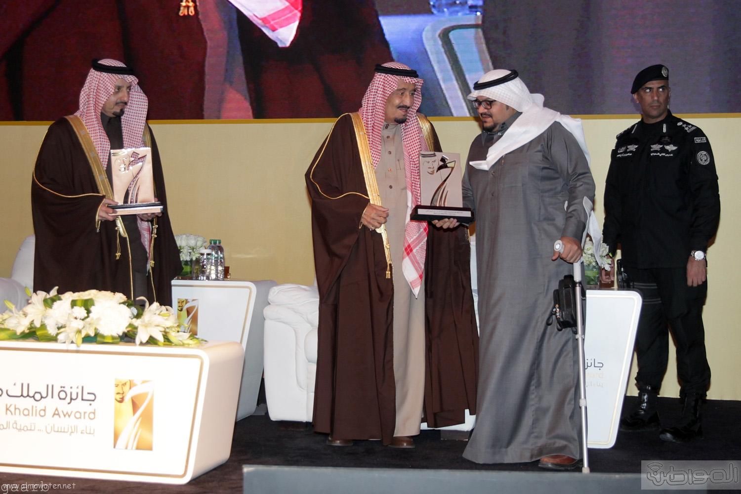 سلم خادم الحرمين الشريفين الملك سلمان بن عبدالعزيز المبدع الشاب أحمد زايد المالكي جائزة المركز الثاني لجائزة الملك خالد لشركا التنمية في الحفل الذي رعاه أمس خادم الحرمين الشريفين