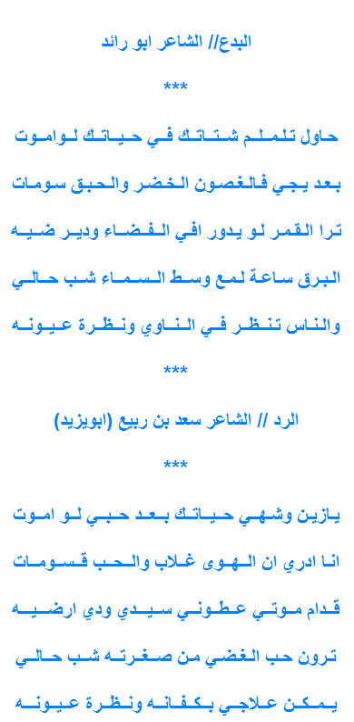 الشاعر المبدع دائما سعد بن ربيع (ابويزيد) قصائده لها نكهه خاصه تحس فيها الابداع والاحساس والعذوبه والنعومه واختياره للمفردات فيه تميز دائما شاعر مبدع حقا اخترنا لكم هذه القصيده البدع كان من ابو رائد والرد كان من ابو يزيد