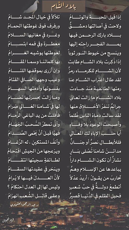جادة قريحة الشاعر الدكتور عبدالرحمن بن صالح العشماوي بهذه القصيده وهي تعبر عن ما يحدث في بلاد الشام من حروب ومن انتهاك للقيم الانسانيه نسال الله النصر للاسلام والمسلمين.
