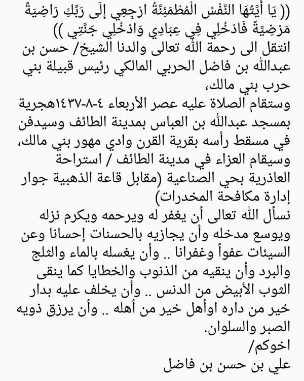 شبكة بني مالك تقدم احر التعازي والمواساة الى أسرة ال فاضل والى قبيلة بني حرب والى قبيلة بني مالك عموما... رحم الله الفقيد رحمة واسعه واسكنه فسيح جناته وانا لله وانا اليه راجعون .