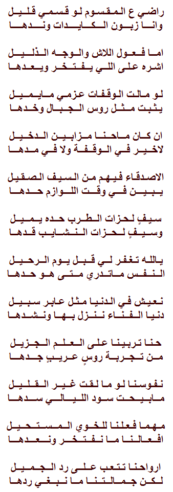 وربما تكرر سماعها عدة مرات في قروبات متعددة لكنها تستحق الإعادة لما فيها من قوّة المعنى وحُسْن التراكيب الشعرية والصور والتشبيهات الجمالية .فيها الفخر والإعتزاز والثقة بالنفس ،فيها الحكمة والحكمة ضالة المؤمن .