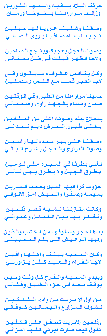 قصيده تراثيه وكلماتها لا يمكن أن يعرفها الا من عاصر وعاش تلك الحقبه الزمنيه .. القصيده رائعه وهي للشاعر جارالله بن حسين المالكي .. نقول صح لسانك يا ابوحسين كفيت ووفيت وفصلت لنا تلك السنين الخوالي بما فيها من تراث وعلوم كانت حاضره في ذاكرة الكثير من الناس ...