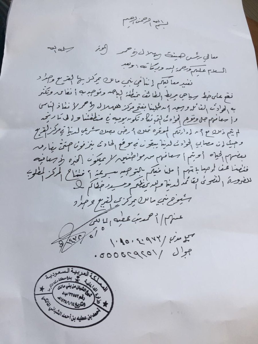 في خطاب تم تقديمه على معالي رئيس هيئة الهلال الاحمر السعودي قام بتقدمه الشيخ أحمد بن عطيه ابو طلايب يطالب فيه الهلال الاحمر بالعمل على إيجاد فرع في بلاد بني مالك الطائف يباشر من خلاله الحوادث التي تقع على الطريق السياحي والذي يمر عبر ديار بني مالك وتكثر فيه الحوادث في المرتفعات والانفاق واصبح وجود فرع للهلال الاحمر ضرورة قصوى لكثرة الحوادث ... ونحن بدورنا نشكر الشيخ ابو يحيى على هذا الاهتمام الغير مستغرب منه ونتمنى ان يتحقق مايطالب به في هذا الشان .