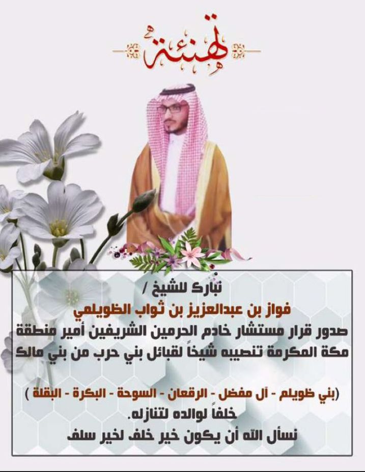 صدرت موافقة صاحب السمو الملكي الامير خالد الفيصل أمير منطقة مكة المكرمة على تعيين الشيخ فواز بن عبدالعزيز بن حمدان بن ثواب المالكي شيخ قبائل بني حرب الجائزه ( بني ظويلم -آل مفضل - الرقعان - السوحه -البكره - البقله ) خلفاًلوالده الشيخ عبدالعزيز بن حمدان الذي تنازل بها لإبنه فواز .