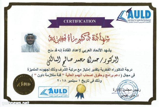الاتحاد العربي لإعداد القادة تكرم رئيس مجلس إدارة صحيفة غرب الاخبارية الاعلامي الاستاذ حمدان محمد المالكي بالدكتوراه الفخريه نظير ما قدم ويقدم من خدمات اجتماعيه في منطقته والتمييز في مجال دعم برامج وحقوق الهمم العالية . فئة متلازمة داون ..