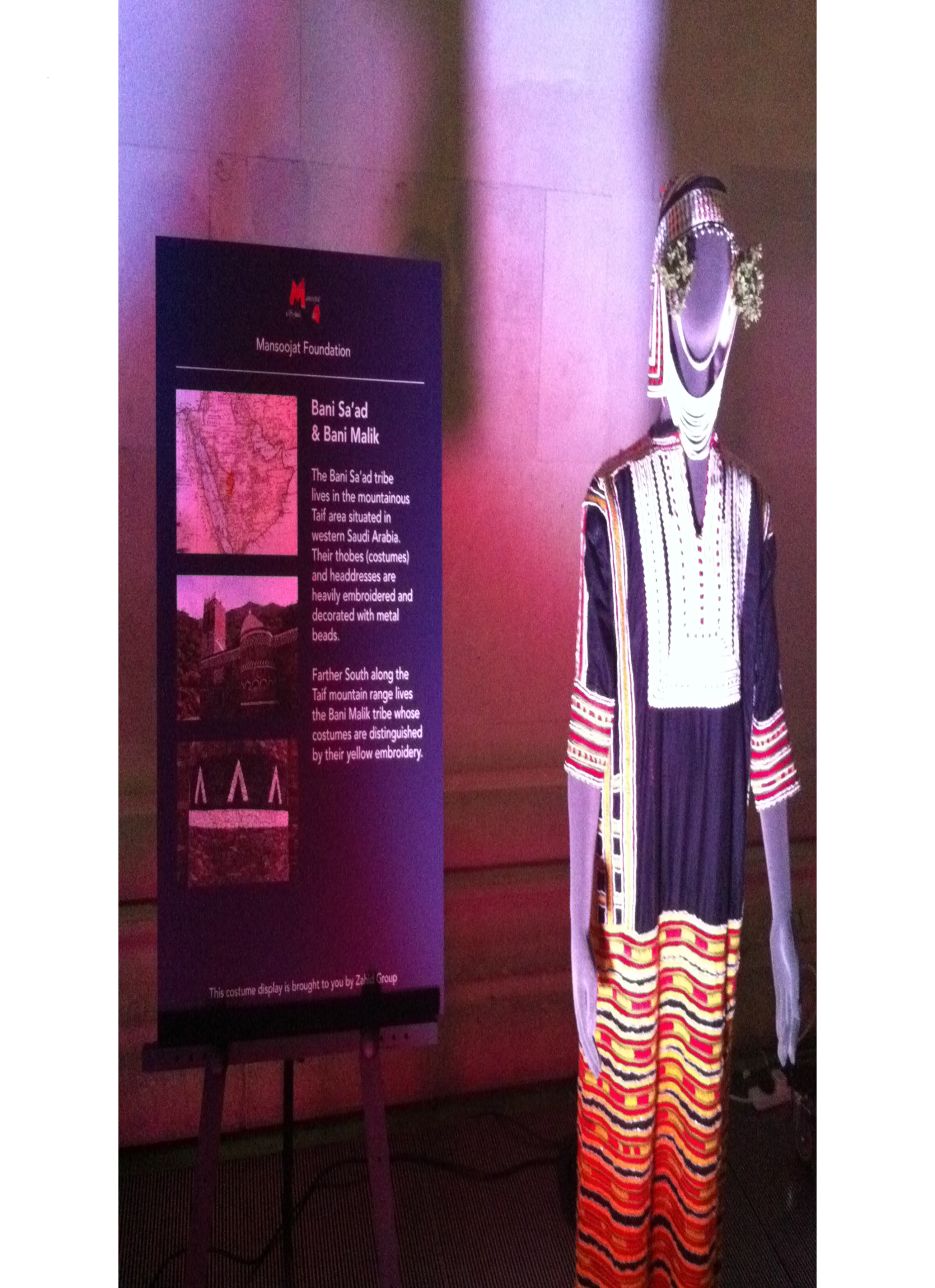 وعُقدت أيضا حول الثقافة والحضارات العربية لكن حقيقه ما اثار دهشتي،كان هناك فستان جميل بين المعارض كان اللباس التقليدي لنساء "بني مالك"ومن شدة فخري وفرحتي التقطت له صورة بكامرة الجوال فاعذروني على ردائة الجودة .