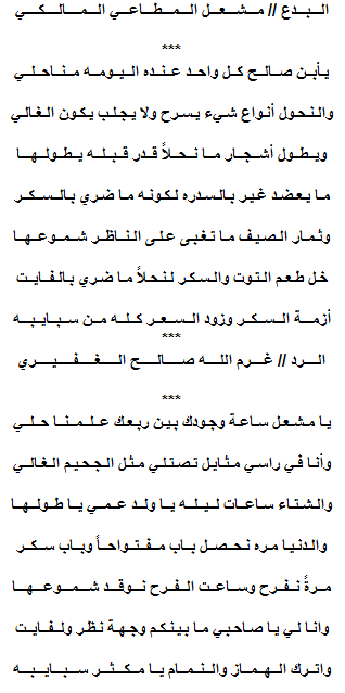هذه القصيده بدع من الاخ مشعل المطاع المالكي وهي عباره عن مسيره او زمله رائعه في معانيها واسلوب طرحها كان الرد من الاخ غرم الله بن صالح الغفيري المالكي وايضا كان الرد هو الآخر لا يقل رواعه جمال عن بدع الاخ مشعل .