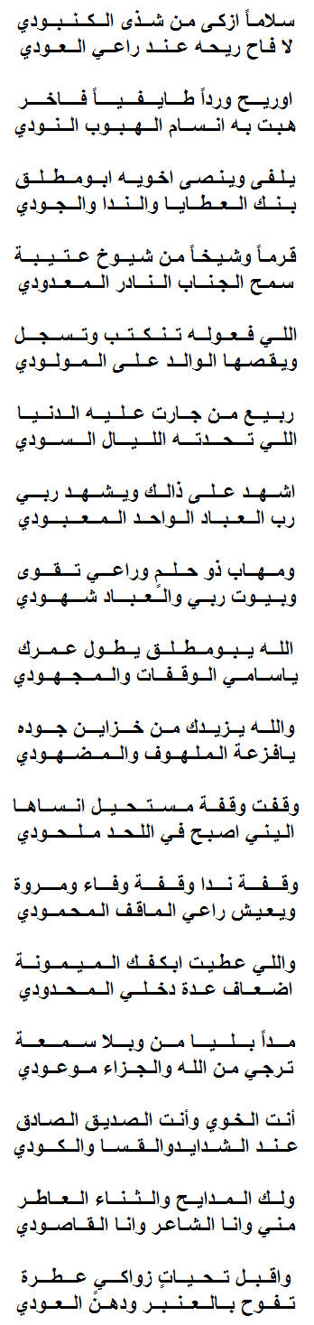 هذه الابيات جادة بها قريحة الشاعر المبدع دائما الاستاذ جندب البشراني المالكي وكما هو معروف عن الشاعر ابو عبدالرحمن له اسهامات ومشاركات وقصائد نبطيه وقصائد عرضه ومجالسي في الكثير من المواقع على الشبكة العنكبوتيه وهذه الابيات يمتدح فيها احد اصدقائه .