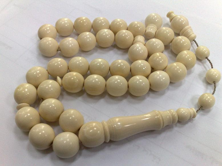 * العاج : لونها أبيض مائل للاحمرار وتسمى سبحة( ناب الفيل) والعاج الطبيعي لايمكن أن يحترق أو يتغير لونه لأي سبب من الأسباب ويوجد في الأسواق سبح أخرى من سبح ناب الفيل وهي سبح غير طبيعية مصنوعة من العاج الصناعي الذي يحترق ويتغير لون السبحة الى اللون الأسود عند تعريضها للنار . وسعرها يتراوح بين 500 و1.000ريال