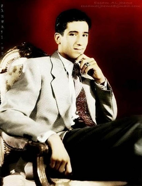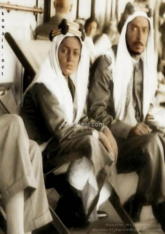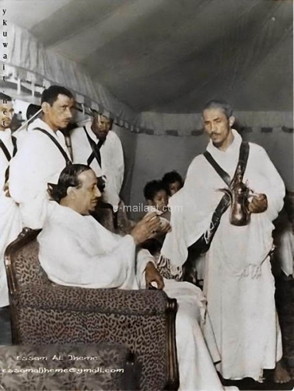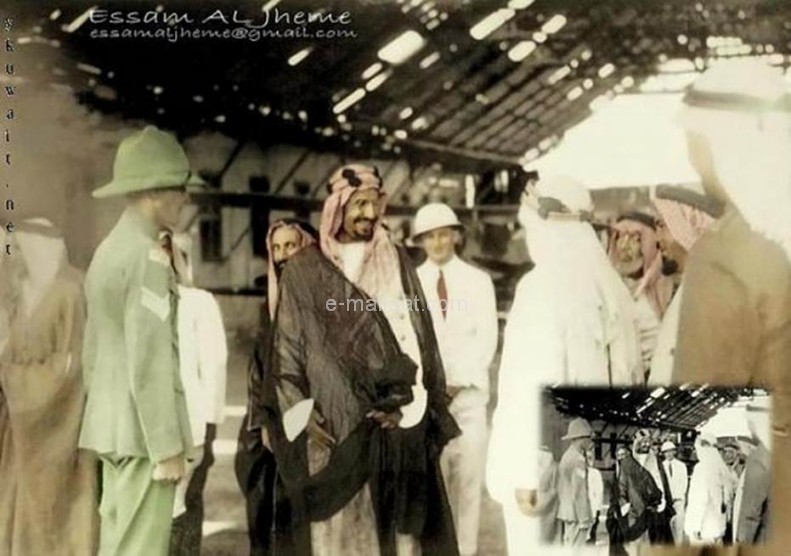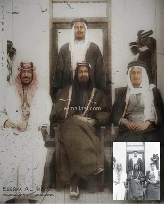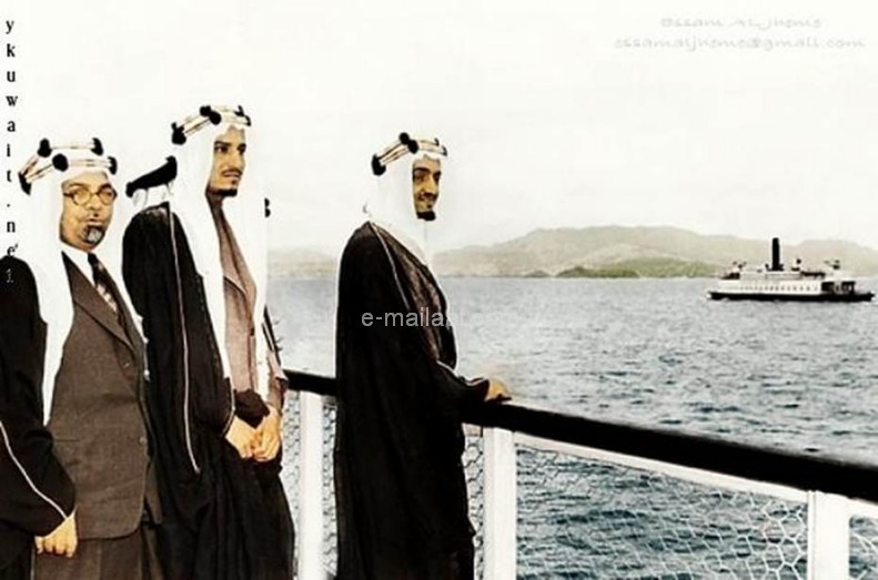 الملك خالد بن عبدالعزيز ( من يمين الصوره ) والامير احمد الجابر امير الكويت والملك سعود بن عبدالعزيز – الكويت 1942