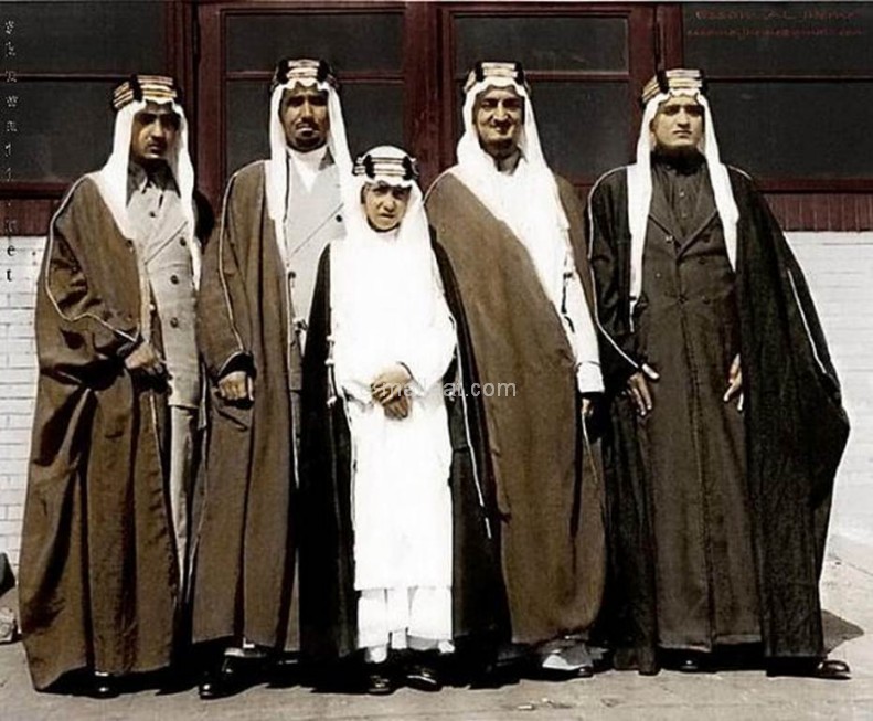 الملك عبدالعزيز في وسط ابناءه وهم من اليسار إلى اليمين الامير مشعل والامير طلال والامير نواف والامير متعب